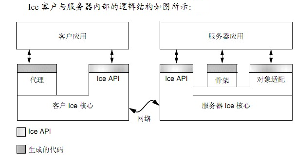 这个图示显示了使用ICE做为中间件平台,客户端及服务端的应用都是由应用代码及ICE的库代码混合组成的。