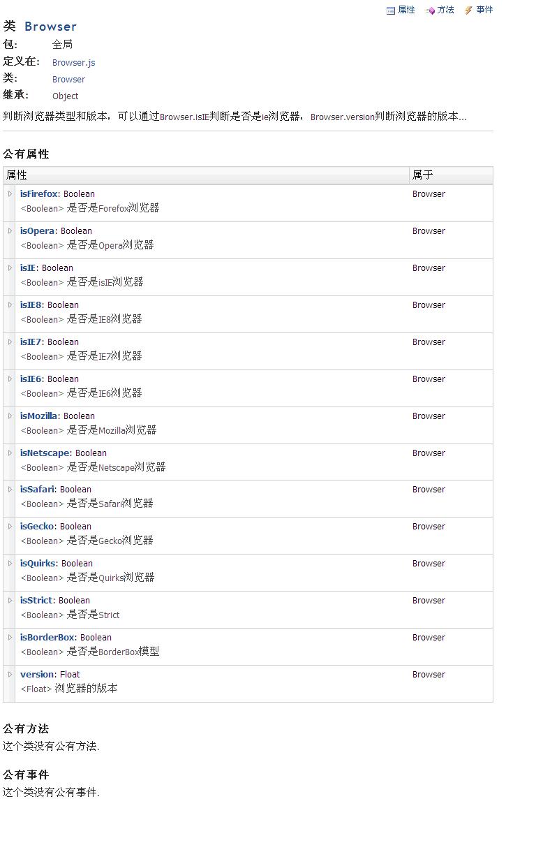 /** * @class Browser 判断浏览器类型和版本,可以通过Browser.isIE判断是否是ie浏览器,Browser.version判断浏览器的版本... * @author Darkness * @version 1.0 * @since JDF 1.0 */window["Browser"] = {};(function() {if (Browser.platform) {return;}var ua = window.navigator.userAgent.toLowerCase();Browser.platform = window.navigator.platform;/** * @property {Boolean} isFirefox 是否是Forefox浏览器 */Browser.isFirefox = ua.indexOf("Firefox") > 0;/** * @property {Boolean} isOpera 是否是Opera浏览器 */Browser.isOpera = typeof (window.opera) == "object";/** * @property {Boolean} isIE 是否是isIE浏览器 */Browser.isIE = ua.indexOf("msie") != -1;/** * @property {Boolean} isIE8 是否是IE8浏览器 */Browser.isIE8 = !!window.XDomainRequest && !!document.documentMode;/** * @property {Boolean} isIE7 是否是IE7浏览器 */Browser.isIE7 = ua.indexOf("msie 7.0") != -1 && !Browser.isIE8;/** * @property {Boolean} isIE6 是否是IE6浏览器 */Browser.isIE6 = ua.indexOf("msie 6.0") != -1;/** * @property {Boolean} isMozilla 是否是Mozilla浏览器 */Browser.isMozilla = window.navigator.product == "Gecko";/** * @property {Boolean} isNetscape 是否是Netscape浏览器 */Browser.isNetscape = window.navigator.vendor == "Netscape";/** * @property {Boolean} isSafari 是否是Safari浏览器 */Browser.isSafari = ua.indexOf("Safari") > -1;/** * @property {Boolean} isGecko 是否是Gecko浏览器 */Browser.isGecko = ua.indexOf("gecko") != -1;/** * @property {Boolean} isQuirks 是否是Quirks浏览器 */Browser.isQuirks = document.compatMode == "BackCompat";/** * @property {Boolean} isStrict 是否是Strict */Browser.isStrict = document.compatMode == "CSS1Compat";/** * @property {Boolean} isBorderBox 是否是BorderBox模型 */Browser.isBorderBox = Browser.isIE && Browser.isQuirks;if (Browser.isFirefox) {var re = /Firefox(\s|\/)(\d+(\.\d+)?)/;} else {if (Browser.isIE) {var re = /MSIE( )(\d+(\.\d+)?)/;} else {if (Browser.isOpera) {var re = /Opera(\s|\/)(\d+(\.\d+)?)/;} else {if (Browser.isNetscape) {var re = /Netscape(\s|\/)(\d+(\.\d+)?)/;} else {if (Browser.isSafari) {var re = /Version(\/)(\d+(\.\d+)?)/;} else {if (Browser.isMozilla) {var re = /rv(\:)(\d+(\.\d+)?)/;}}}}}}if ("undefined" != typeof (re) && re.test(ua)) {/** * @property {Float} version 浏览器的版本 */Browser.version = parseFloat(RegExp.$2);}})();