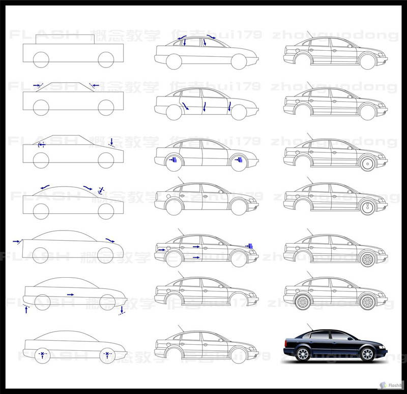 鼠绘-汽车侧面绘制过程 鼠绘,着重训练学生直线工具,矩形,椭圆,及选择工具的实际应用。新学期,鼠绘又一期,这是汽车的侧面,附带所有过程及专用版权实例图示。最终效果:本文转自:http://www.5uflash.com/flashjiaocheng/Flashdonghuajiaocheng/4485.html