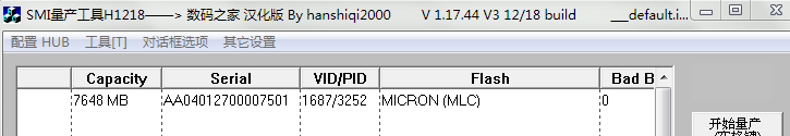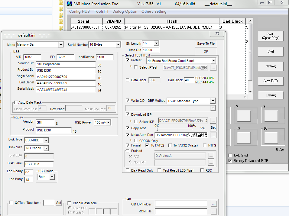 3.在量化工具中设置HUB自动,使用工厂驱动,填写设置参数,开始量化。我第一次量化直接失败了,提示open fail。无论我怎么倒腾,总是open fail,疯狂google了一阵,一个网友说的话提醒了我:他说可能是文件不全,导致要打开的文件找不到。于是我开始疯狂的下载SM325量产工具的各种版本,下了大概有7,8个,最终一个英文版终于不报错了,量产OK。这个英文版是smi mass production tool V1.17.55 0416,大小有3.29M。