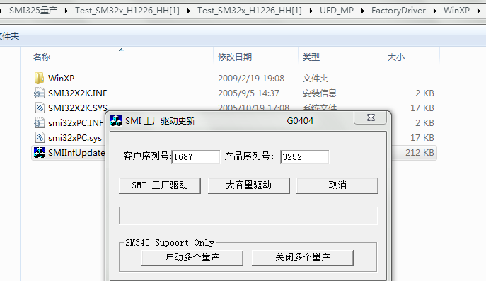 2.然后安装工厂驱动,就是执行量化工具文件夹下的\UFD_MP\FactoryDriver\WinXP\SMIInfUpdate.exe。填写上面记录好的VID/PID,点击“SMI工厂驱动”。注意,无忧那哥们安工厂驱动时,VID/PID是默认的没改,但是我机器上使用默认值根本装不上驱动,改为记录好的VID/PID才可以安装成功。安装工厂驱动的目的是为了用芯片商自己的驱动代替默认的usb mass storage device