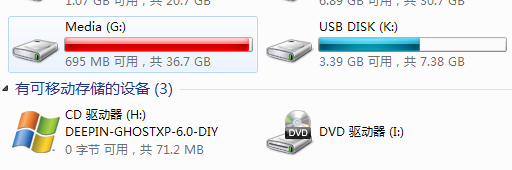 4.量化成功,在资源管理器中可以看到有一个7个多G的U盘以及一个带自启动得USB-ROM,重启电脑,在BIOS中设置启动时USB-ROM优先,测试发现,开机从U盘启动winxp PE系统成功。