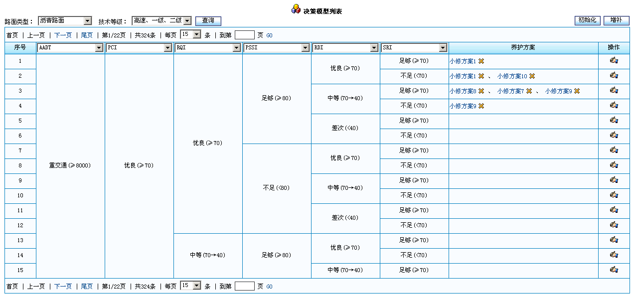 /** * 表格过滤功能 * tabObj 表格对象 * 特点: * 1. 支持单元格合并后的表格; * 2. 支持多列同时过滤; * 3. 对外部提供接口:callSetFilterFunc,callDataFunc,callSetDefaultFunc分别调用外部的动态获取下拉框选项、给过滤的下拉框设定默认选项、保存所设置的过滤条件到页面hidden; * 4. 过滤的触发交给页面的查询按钮; * * Sample: * <script> * var params = { *filterCols:[1,2,3,4,5,6], //参数"[1,2,3,4,5,6]":给第2至7列增加过滤功能(列序号是从0开始计) *lastIndexOfMaxCol:1,//右边起,最后一个无过滤条件的列的逆序号,从0开始计 *callDataFunc:getFilterOptions,//动态获取下拉框选项数据 *callSetDefaultFunc:setDefaultCondition,//给过滤的下拉框设定默认选项 *callSetFilterFunc:setFilter,//保存过滤下拉框的选项 *headerRow:1//列表表头行序号,默认是0 *}; *var columnFilter = new ColumnFilter($("tabDecisionPath")); *columnFilter.addHandler(params); * </script> */function ColumnFilter(tabObj){// 表格对象var _tabObj = tabObj; //表格列数var colNumber;//如果列数是动态变化的,则用maxCol来表示需要过滤的最大列序 var maxCol; //下拉选项var select = "";//参数var params = {//要添加过滤功能的列的数组//filterCols: [1,2,3,4,5,6],//右边起,最后一个无过滤条件的列的逆序号,从0开始计//lastIndexOfMaxCol:1,//动态获取下拉框选项数据//callDataFunc:getFilterOptions,//给过滤的下拉框设定默认选项//callSetDefaultFunc:setDefaultCondition,//保存过滤下拉框的选项//callSetFilterFunc:setFilter,//列表表头行序号,默认是0headerRow: 0};//方法集合var methods = {/** 检查参数是否合法 */doCheckParams:function(parameters){if(parameters.filterCols==null || parameters.filterCols==undefined || parameters.filterCols.length==0){return false;};if(parameters.lastIndexOfMaxCol==null || parameters.lastIndexOfMaxCol==undefined){return false;};if(parameters.callDataFunc==null || parameters.callDataFunc==undefined){return false;};if(parameters.callSetDefaultFunc==null || parameters.callSetDefaultFunc==undefined){return false;};if(parameters.callSetFilterFunc==null || parameters.callSetFilterFunc==undefined){return false;};if(parameters.headerRow==null || parameters.headerRow==undefined){parameters.headerRow=params.headerRow;};this.params = parameters;return true;},/** 检查参数是否越界 */doCheckCol:function(col){if(col>colNumber-1){return false; }return true;},/** 过滤 */setFilterValue:function(obj,col){var val = obj.options[obj.selectedIndex].value;if(obj.selectedIndex==0){val = "";}var originText = obj.options[0].value;this.params.callSetFilterFunc({key:originText, value:val});},/** 生成过滤器 */doRender:function(col, headerText){var curCol = col;//拼装下拉框select = "<select id='" + headerText + "' onchange='columnFilter.setFilterValue(this," + curCol + ");' style='width:100%;height:100%'>" + "<option value='" + headerText + "'>" + headerText + "</option>"; var optionsStr =this.params.callDataFunc(headerText);if(optionsStr==""){return false;}var options = [];options = optionsStr.split("|");for(var i=0; i<options.length; i++){var arr = options[i].split(",");options[i]={id:arr[0],name:arr[1]};}for(var i=0;i<options.length;i++){select += "<option value='" + options[i].id + "'>" +options[i].name + "</option>";}select += "</select>";_tabObj.rows[this.params.headerRow].cells[curCol].innerHTML = "<div style='width:100%;height:100%;' >" +select + "</div>";return true;}, /** * 给过滤的下拉框设定默认选项 */setDefault:function(headerText){this.params.callSetDefaultFunc($(headerText));},/** * 绑定过滤事件 * params 参数 */addHandler:function(parameters){//检查参数是否合法if(!this.doCheckParams(parameters)){alert("参数错误!");return;} //列表内容行不能为空if($("trr0")==undefined){return;} if(this.params.filterCols==undefined || this.params.filterCols.length==0){return;}colNumber = _tabObj.rows[this.params.headerRow].cells.length;maxCol = colNumber - this.params.lastIndexOfMaxCol - 2;for(var i=0; i<this.params.filterCols.length;i++){var col = this.params.filterCols[i];if(!this.doCheckCol(col)){return;}if(maxCol!=undefined){if(col>maxCol){return;}}//给第col列Header增加单击事件 var headerText = _tabObj.rows[this.params.headerRow].cells[col].innerText;//生成过滤下拉框if(!this.doRender(col, headerText)){continue;}//设置下拉框默认选项this.setDefault(headerText);}}};return methods; }<%@ page contentType="text/html;charset=gbk"%><SCRIPT>//...部分无关js略去/** * 查找某个指标的所有约束条件 * indexName 指标名称,如:AADT, PCI, RQI, PSSI, RDI, SRI * return: options sample:"8a819be52af9ed05012afa1dc007000d","重交通(>=8000)"|"8a819be52af9ed05012afa1e087a000e","中交通(8000->4000)" */function getFilterOptions(indexName){var options;var parameters = "indexStr=" + indexName + "&surfaceType=" + $("surfaceType").value + "&roadGrade=" + $("roadGrade").value; var url = "<ww:url value='/decisionPath!getFilterOptions.action'/>";var ajax = new Ajax.Request(url,{method:'post',parameters:parameters,requestHeaders:{dynenc:"UTF-8"},asynchronous: false,onComplete:function(oriReq){ options=oriReq.responseText.trim();}})return options;}/** * 给过滤的下拉框设定默认选项 * selObj: 下拉框对象 */function setDefaultCondition(selObj){ if($("decisionPath." + selObj.id + "Id").value!=""){selObj.value = $("decisionPath." + selObj.id + "Id").value;}}/** * 保存过滤查询条件 */function setFilter(condition){document.getElementById("decisionPath." + condition.key + "Id").value = condition.value;}</SCRIPT> <BR><form name="actionForm" method="post"> <table align="center" cellspacing="1" cellpadding="1" width="100%" border="0" id="tabDecisionPath"> //....中间表格内容略 </table></form><SCRIPT LANGUAGE="JavaScript">doInit();var params = {filterCols:[1,2,3,4,5,6],lastIndexOfMaxCol:1,callDataFunc:getFilterOption