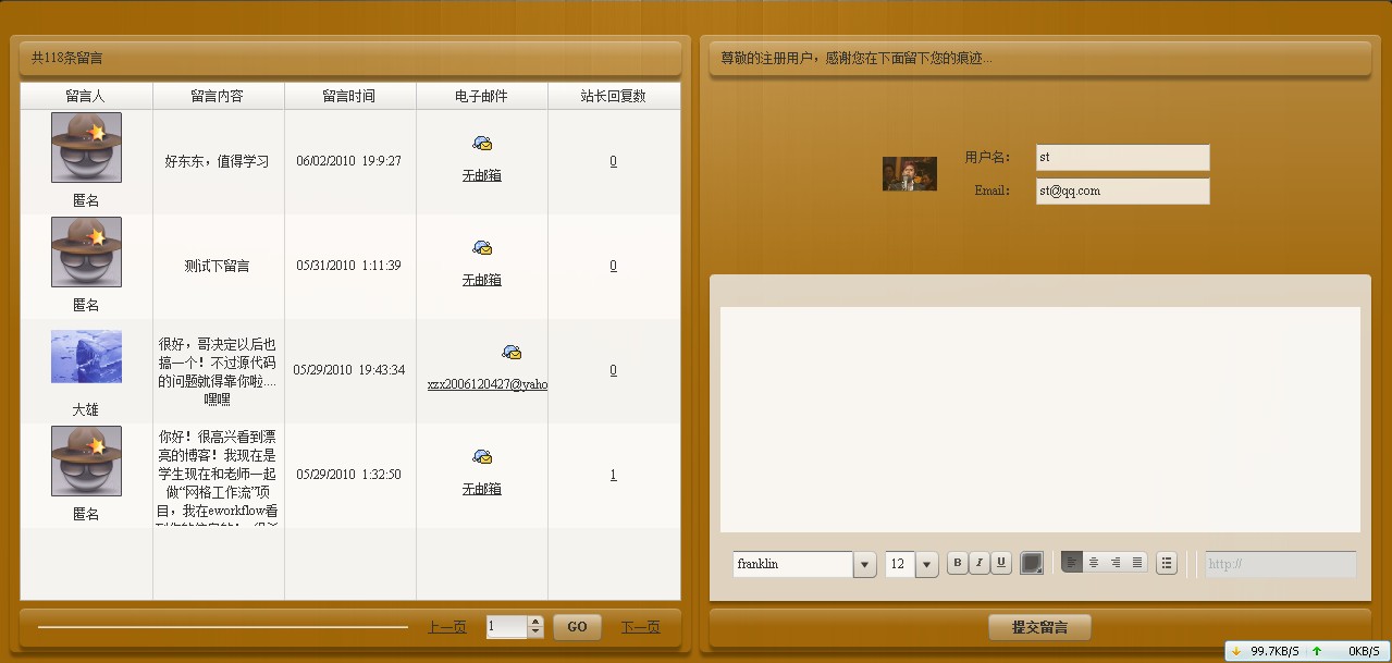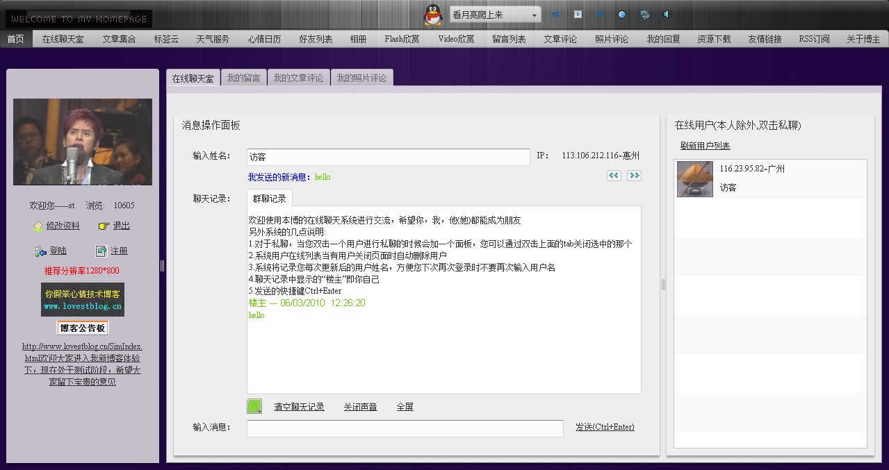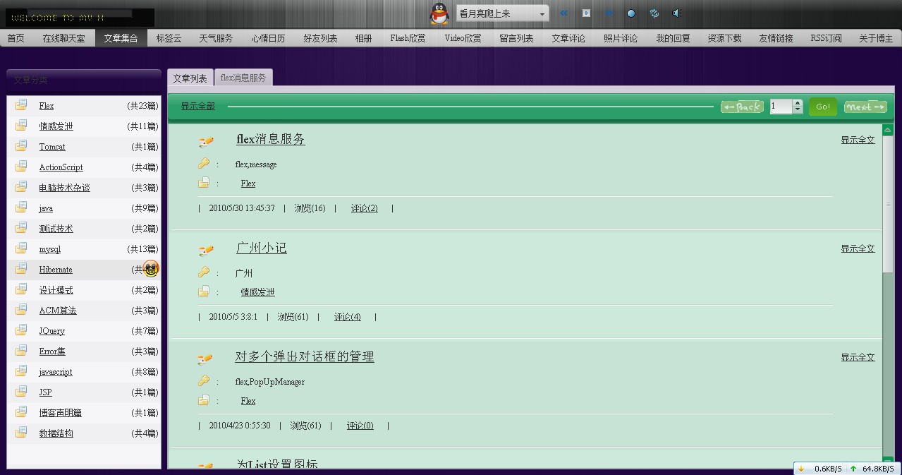 新版博客发布啦 呵呵,废话不多说了,有兴趣的朋友就来我博客转转吧,聆听您宝贵的意见http://www.lovestblog.cn下面是新博客部分截图呀 1 楼 wuxian_Abs 2010-06-10 用flex做的吧。正在研究,不错!!!