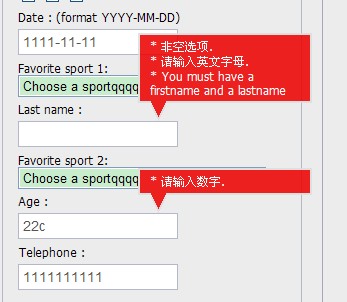 但这样虽然可以用了 但是提示信息就固定了,呵呵 有待继续研究 11 楼 btdf007 2010-12-10 发现了一个bug 在使用ajax验证的时候 如果该项没有失去焦点而是直接按回车提交 不会触发ajax验证 12 楼 maike 2010-12-17 非常感谢。正想用这个 13 楼 chenleijiangjun 2011-03-03 showOnMouseOver: true,好像不起作用啊!能不能做到验证错误先把文本框的边框变红,然后鼠标浮上去在提示错误信息呢?谢谢! 14 楼 chenleijiangjun 2011-03-24 楼主帮忙:ajax验证后错误提示信息位置不对,而且ajax验证错误后表单也能提交。请楼主帮忙,万分感谢! 15 楼 cao_jj 2011-11-19 页面显示这个:customAjaxRule没有返回值, 请检查. 可是明明已经传了。alert的时候说undefined 16 楼 matychen 2011-11-19 cao_jj 写道页面显示这个:customAjaxRule没有返回值, 请检查. 可是明明已经传了。alert的时候说undefined