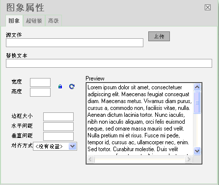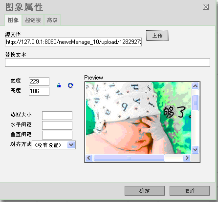 addUploadImage函数指定文件上传页面的URL,然后在一个模态窗口中打开这个页面,处理文件上传。最终的结果是将图片上传后在服务器上的URL地址返回给一个变量imgUrl。最后把这个变量赋值给传进来的图片URL文本框里。最后手工触发一下onchange事件,这样在image对话框里就能看到图片的预览效果了。