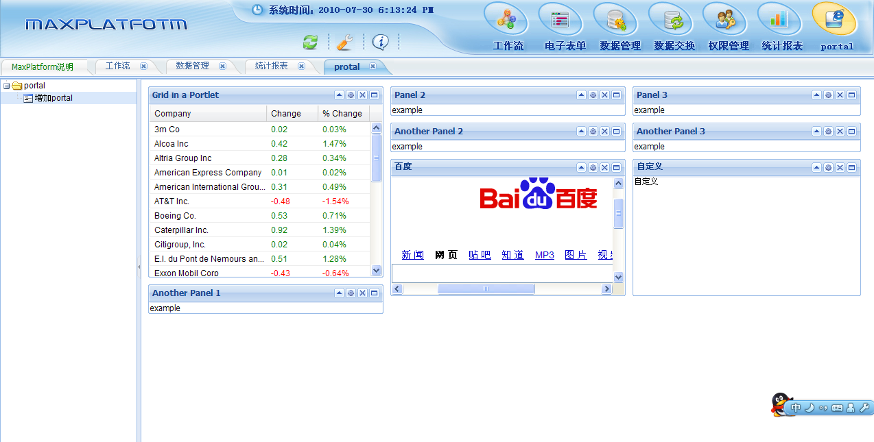 portal是用ext的,只是对其进行了响应的扩展,能够实现排版后的保存、自定义portalet、并且自定义内容可以可视化添加、并实现了portal内的权限定义(显示/不显示)。