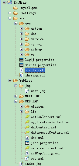先看总体分包情况,现在所有配置文件都写在WEB-INF下,如果要写在src的某个包下的话要改变一下路径。