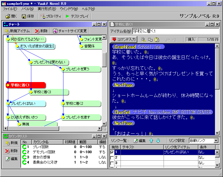 这个引擎强调其使用的简单性,制作游戏时以鼠标操作为主,在图形界面上拖出流程图,在流程的每个节点上编辑细节。只是流程图功能的话,Macromedia/Adobe Authorware和Yuuki! Novel等许多authoring tool/game engine都有,还不算最特别的地方。