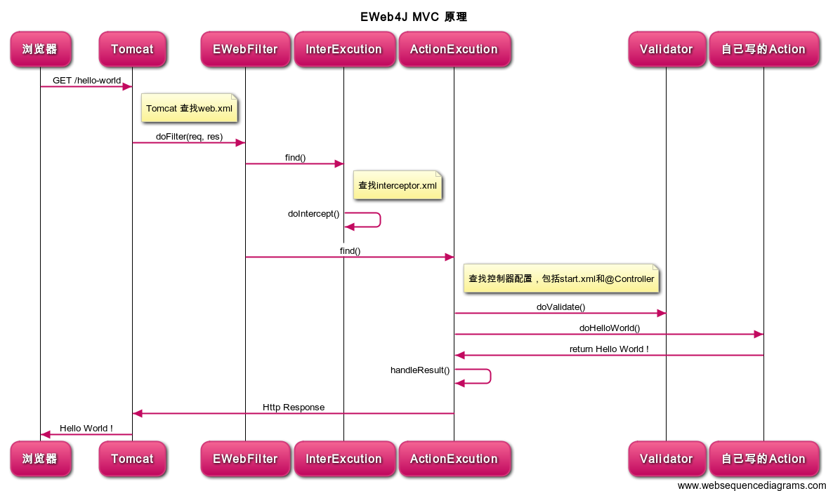 title EWeb4J MVC 原理浏览器->Tomcat: GET /hello-worldnote right of Tomcat: Tomcat 查找web.xmlTomcat->EWebFilter: doFilter(req, res)EWebFilter->InterExcution: find()note right of InterExcution: 查找interceptor.xmlInterExcution->InterExcution: doIntercept()EWebFilter->ActionExcution: find()note right of ActionExcution:查找控制器配置,包括start.xml和@ControllerActionExcution->Validator: doValidate()ActionExcution->自己写的Action: doHelloWorld()自己写的Action->ActionExcution: return Hello World !ActionExcution->ActionExcution:handleResult()ActionExcution->Tomcat: Http ResponseTomcat->浏览器: Hello World !