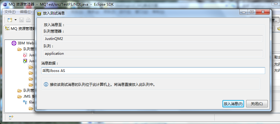 在MQ管理器中,在application队列放入一个消息: