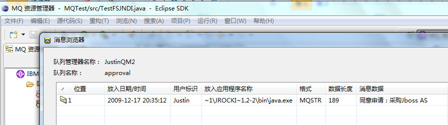 如果所有配置正确,则MDB->MQTestBean2会接收到刚刚放入的消息,并进行处理,然后放到approval队列: