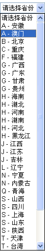 <select name='sheng' onchange='JavaScript:areas_load(this.value);'><option value='0'>请选择省份</option><option value='13'>A - 安徽</option><option value='33'>A - 澳门</option><option value='1'>B - 北京</option><option value='4'>C - 重庆</option><option value='14'>F - 福建</option><option value='21'>G - 广西</option><option value='20'>G - 广东</option><option value='28'>G - 甘肃</option><option value='24'>G - 贵州</option><option value='22'>H - 海南</option><option value='18'>H - 湖北</option><option value='17'>H - 河南</option><option value='19'>H - 湖南</option><option value='5'>H - 河北</option><option value='10'>H - 黑龙江</option><option value='15'>J - 江西</option><option value='11'>J - 江苏</option><option value='9'>J - 吉林</option><option value='8'>L - 辽宁</option><option value='30'>N - 宁夏</option><option value='7'>N - 内蒙古</option><option value='29'>Q - 青海</option><option value='6'>S - 山西</option><option value='23'>S - 四川</option><option value='2'>S - 上海</option><option value='16'>S - 山东</option><option value='27'>S - 陕西</option><option value='3'>T - 天津</option><option value='34'>T - 台湾</option><option value='26'>X - 西藏</option><option value='31'>X - 新疆</option><option value='32'>X - 香港</option><option value='25'>Y - 云南</option><option value='12'>Z - 浙江</option></select><SELECT NAME="shi" id="shi" onchange="JavaScript:area_load(this.value);"><option value=''>请选择地级市</option></SELECT>