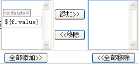 $(document).ready(function(){ $('#addto').click(function(){ var $options = $('#select1 option:selected');//获取当前选中的项 var $remove = $options.remove();//删除下拉列表中选中的项 $remove.appendTo('#select2');//追加给对方 }); $('#remove').click(function(){ var $removeOptions = $('#select2 option:selected'); $removeOptions.appendTo('#select1');//删除和追加可以用appendTo()直接完成 }); $('#addAll').click(function(){ var $options = $('#select1 option'); $options.appendTo('#select2'); }); $('#removeAll').click(function(){ var $options = $('#select2 option'); $options.appendTo('#select1'); }); //双击事件 $('#select1').dblclick(function(){ //var $options = $('#select1 option:selected'); var $options = $('option:selected', this);//注意此处“option”与“:”之间的空格,有空格是不可以的 $options.appendTo('#select2'); }); $('#select2').dblclick(function(){ $('#select2 option:selected').appendTo('#select1'); }); }); <div align="center"><table><tr><td><select multiple="multiple" id="select1"style="width: 100px; height: 100px;"><s:iterator value="fMap" id="f"><option value="${f.key}">${f.value}</option></s:iterator></select></td><td><button type="button" id="addto">添加>></button><br/><br/><button type="button" id="remove"><<移除</button></td><td><select multiple="multiple" id="select2" name="fids"style="width: 100px; height: 100px;"></select></td></tr></table></div><div align="center"><button type="button" id="addAll">全部添加>></button> <button type="button" id="removeAll"><<全部移除</button></div>
