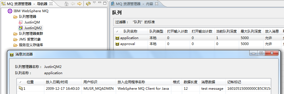 import com.ibm.mq.MQEnvironment;import com.ibm.mq.MQMessage;import com.ibm.mq.MQQueue;import com.ibm.mq.MQQueueManager;import com.ibm.mq.constants.MQConstants;/** * via MQ API * @author Justin * */public class TestViaAPI {public static void main(String[] args) throws Exception {String qManager = "JustinQM2";String qManagerHost = "127.0.0.1";String queueName = "application";MQEnvironment.channel = "SYSTEM.DEF.SVRCONN";MQEnvironment.hostname = qManagerHost;MQQueueManager qMgr = new MQQueueManager(qManager);System.out.println("open queue");MQQueue mqQueue = qMgr.accessQueue(queueName, MQConstants.MQOO_INPUT_AS_Q_DEF| MQConstants.MQOO_OUTPUT);MQMessage mqMsg = new MQMessage();mqMsg.write("test message".getBytes());mqQueue.put(mqMsg);System.out.println("close queue");mqQueue.close();System.out.println("close queue mamager");qMgr.disconnect();}}