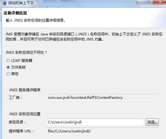 import java.util.Hashtable;import javax.jms.Queue;import javax.jms.QueueConnection;import javax.jms.QueueConnectionFactory;import javax.jms.QueueSender;import javax.jms.QueueSession;import javax.jms.Session;import javax.jms.TextMessage;import javax.naming.Context;import javax.naming.InitialContext;/** * * * @author Justin * */public class TestFSJNDI {public static void main(String[] args) throws Exception {Hashtable<String, String> env = new Hashtable<String, String>();env.put(Context.INITIAL_CONTEXT_FACTORY, "com.sun.jndi.fscontext.RefFSContextFactory");env.put(Context.PROVIDER_URL, "file:/C:/Users/Justin/jndi");Context jndiContext = new InitialContext(env);QueueConnectionFactory sendFactory = (QueueConnectionFactory) jndiContext.lookup("applicationFactory");Queue queue = (Queue) jndiContext.lookup("applicationJMSQueue");QueueConnection queueConnection = sendFactory.createQueueConnection();queueConnection.start();QueueSession queueSession = queueConnection.createQueueSession(false,Session.AUTO_ACKNOWLEDGE);QueueSender queueSender = queueSession.createSender(queue);TextMessage textMsg = queueSession.createTextMessage("test post message via jndi");queueSender.send(textMsg);queueConnection.close();}}