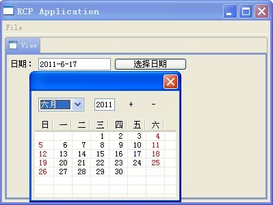 package org.autumn.rcp.learn;import java.util.Calendar;import java.util.regex.Pattern;import org.eclipse.jface.dialogs.Dialog;import org.eclipse.swt.SWT;import org.eclipse.swt.events.MouseAdapter;import org.eclipse.swt.events.MouseEvent;import org.eclipse.swt.events.SelectionAdapter;import org.eclipse.swt.events.SelectionEvent;import org.eclipse.swt.graphics.Color;import org.eclipse.swt.graphics.Point;import org.eclipse.swt.graphics.Rectangle;import org.eclipse.swt.layout.GridLayout;import org.eclipse.swt.widgets.Combo;import org.eclipse.swt.widgets.Composite;import org.eclipse.swt.widgets.Control;import org.eclipse.swt.widgets.Event;import org.eclipse.swt.widgets.Label;import org.eclipse.swt.widgets.Listener;import org.eclipse.swt.widgets.Shell;import org.eclipse.swt.widgets.Table;import org.eclipse.swt.widgets.TableColumn;import org.eclipse.swt.widgets.TableItem;import org.eclipse.swt.widgets.Text;public class DatepickerDialog extends Dialog {private Text date;private Table table;private TableItem selectedTableItem;private String[] months = { "一月", "二月", "三月", "四月", "五月", "六月", "七月", "八月", "九月", "十月", "十一月", "十二月" };private int[] daysOfMonth = { 31, 28, 31, 30, 31, 30, 31, 31, 30, 31, 30, 31 };private String[] days = { "日", "一", "二", "三", "四", "五", "六" };private int year;private int month;private int day;protected DatepickerDialog(Shell parentShell) {super(parentShell);}public DatepickerDialog(Shell shell, Text date) {this(shell);this.date = date;init();}private void init() {String dateStr = date.getText();if (Pattern.matches("^\\d{4}-\\d{1,2}-\\d{1,2}$", dateStr)) {String[] str = dateStr.split("-");year = Integer.parseInt(str[0]);month = Integer.parseInt(str[1]) - 1;day = Integer.parseInt(str[2]);} else {year = Calendar.getInstance().get(Calendar.YEAR);month = Calendar.getInstance().get(Calendar.MONTH);day = Calendar.getInstance().get(Calendar.DAY_OF_MONTH);}}@Overrideprotected Control createContents(Composite parent) {parent.setLayout(new GridLayout(1, false));createYearMonthComposite(parent);table = new Table(parent, SWT.SINGLE | SWT.FULL_SELECTION | SWT.BORDER_SOLID);table.setHeaderVisible(true);table.setLinesVisible(true);createColumns(); // Create the columnsfillDayCell();addTableListeners();return parent;}private void fillDayCell() {for (TableItem item : table.getItems()) {item.dispose();}Calendar calendar = Calendar.getInstance();calendar.set(year, month, 1);int dayOfWeek = calendar.get(Calendar.DAY_OF_WEEK);for (int i = 0, d = 0; i <= 5; i++) {TableItem item = new TableItem(table, SWT.NONE);for (int j = 0, n = table.getColumnCount(); j < n; j++) {if ((d == 0 && j < (dayOfWeek - 1)) || d >= daysOfMonth[month]) {continue;}item.setText(j, (++d + ""));if (d == day) { // 今天Color blue = getShell().getDisplay().getSystemColor(SWT.COLOR_BLUE);item.setForeground(j, blue);} else if (j == 0 || j == n - 1) { // 周末Color red = getShell().getDisplay().getSystemColor(SWT.COLOR_RED);item.setForeground(j, red);}}}}private void createYearMonthComposite(Composite parent) {Composite composite = new Composite(parent, SWT.NONE);GridLayout gl = new GridLayout(4, false);gl.horizontalSpacing = 15;composite.setLayout(gl);// 月份final Combo monthCombo = new Combo(composite, SWT.DROP_DOWN | SWT.READ_ONLY);monthCombo.setItems(months);monthCombo.select(month);monthCombo.addSelectionListener(new SelectionAdapter() {public void widgetSelected(SelectionEvent e) {month = monthCombo.getSelectionIndex();fillDayCell();}});// 年final Text yearText = new Text(composite, SWT.BORDER);yearText.setText("" + year);handleLeapYearCondition();Label plus = new Label(composite, SWT.NONE);plus.setText(" + ");plus.addMouseListener(new MouseAdapter() {public void mouseDown(MouseEvent e) {yearText.setText(++year + "");handleLeapYearCondition();fillDayCell();}});Label minus = new Label(composite, SWT.NONE);minus.setText(" - ");minus.addMouseListener(new MouseAdapter() {public void mouseDown(MouseEvent e) {yearText.setText(--year + "");handleLeapYearCondition();fillDayCell();}});}private void handleLeapYearCondition() {if (isLeapYear()) {daysOfMonth[1] = 29;} else {daysOfMonth[1] = 28;}}private void addTableListeners() {// 鼠标悬停时给选中单元格加黄色背景table.addListener(SWT.MouseHover, new Listener() {@Overridepublic void handleEvent(Event event) {Point pt = new Point(event.x, event.y);selectedTableItem = table.getItem(pt);if (null == selectedTableItem) {return;}int column = getSelectedColumn(pt);String text = selectedTableItem.getText(column);if (null == text || text.trim().equals("")) {return;}Color yellow = getShell().getDisplay().getSystemColor(SWT.COLOR_YELLOW);selectedTableItem.setBackground(column, yellow);}});// 鼠标移动时给选中单元格加白色背景table.addListener(SWT.MouseMove, new Listener() {@Overridepublic void handleEvent(Event event) {Point pt = new Point(event.x, event.y);selectedTableItem = table.getItem(pt);if (null == selectedTableItem) {return;}Color white = getShell().getDisplay().getSystemColor(SWT.COLOR_WHITE);selectedTableItem.setBackground(getSelectedColumn(pt), white);}});// 鼠标进入时返回选中的日期字符串table.addListener(SWT.MouseDown, new Listener() {@Overridepublic void handleEvent(Event event) {Point pt = new Point(event.x, event.y);selectedTableItem = table.getItem(pt);if (null == selectedTableItem) {return;}String day = selectedTableItem.getText(getSelectedColumn(pt));date.setText(year + "-" + (month + 1) + "-" + day);setReturnCode(OK);close();}});}private boolean isLeapYear() {return ((year % 4 == 0 && year % 100 != 0) || (year % 400 == 0));}private int getSelectedColumn(Point pt) {int column = 0;for (int i = 0, n = table.getColumnCount(); i < n; i++) {Rectangle rect = selectedTableItem.getBounds(i);if (rect.contains(pt)) {column = i;break;}}return column;}private TableColumn[] createColumns() {TableColumn[] columns = new TableColumn[days.length];for (int i = 0, n = columns.lengt