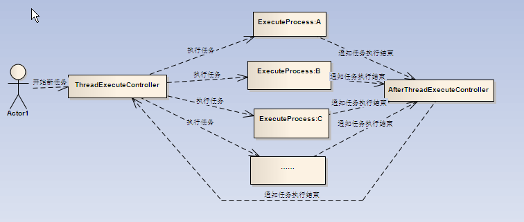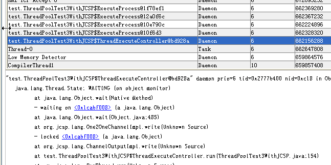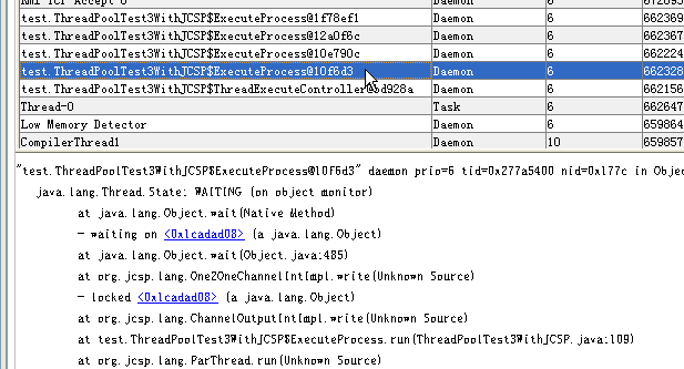 public class ThreadPoolTest3WithJCSP implements Executor {/** * 用于发送任务 */private ChannelOutput startCommandOut;public ThreadPoolTest3WithJCSP(final int threadNum) {//最繁琐的是创建通道,然后让通道的两边分别连到不同的CSProcess上ArrayList<CSProcess> processList = new ArrayList<CSProcess>();One2OneChannel channelUsedForController = StandardChannelFactory.getDefaultInstance().createOne2One();startCommandOut = channelUsedForController.out();One2OneChannel[] channelUsedForExecuter = StandardChannelFactory.getDefaultInstance().createOne2One(threadNum);ChannelOutput[] channeloutputUsedForExecuter = new ChannelOutput[threadNum];for(int i = 0;i<threadNum;i++){channeloutputUsedForExecuter[i] = channelUsedForExecuter[i].out();}StandardChannelIntFactory intFactory = new StandardChannelIntFactory();One2OneChannelInt channelUsedForAfterExecuted = intFactory.createOne2One();One2OneChannelInt[] channelUsedForNotifyTask = intFactory.createOne2One(threadNum);AltingChannelInputInt[] channelInputUsedForNotifyTask = new AltingChannelInputInt[threadNum];for(int i = 0;i<threadNum;i++){channelInputUsedForNotifyTask[i] = channelUsedForNotifyTask[i].in();}ThreadExecuteController controller = new ThreadExecuteController(threadNum, channelUsedForController.in(),channelUsedForAfterExecuted.in(), channeloutputUsedForExecuter);processList.add(controller);ExecuteProcess[] exeProcesses = new ExecuteProcess[threadNum];for(int i = 0;i<threadNum;i++){exeProcesses[i] = new ExecuteProcess(channelUsedForExecuter[i].in(), channelUsedForNotifyTask[i].out(), i);processList.add(exeProcesses[i]);}AfterThreadExecuteController atec = new AfterThreadExecuteController(channelInputUsedForNotifyTask, channelUsedForAfterExecuted.out());processList.add(atec);final CSProcess[] pArray = new CSProcess[processList.size()];for(int i = 0;i<pArray.length;i++)pArray[i] = processList.get(i);new Thread(new Runnable() {@Overridepublic void run() {new Parallel(pArray).run();}}).start();}@Overridepublic void execute(Runnable command) {startCommandOut.write(command);}//任务执行者static private class ExecuteProcess implements CSProcess{final ChannelInput in;final ChannelOutputInt out;final int index;public ExecuteProcess(ChannelInput i,ChannelOutputInt o,final int index) {in = i;out = o;this.index = index;}@Overridepublic void run() {while(true){Runnable r = (Runnable)in.read();r.run();System.out.println("complete");out.write(index);}}}//任务控制者static private class ThreadExecuteController implements CSProcess{private final int MAXTHREADNUM;final ChannelOutput[] executeCS;private Queue<ChannelOutput> waitingThreadQueue = new LinkedList<ChannelOutput>();private Queue<Runnable> waitingTask = new LinkedList<Runnable>();Alternative executeAlt;final int COMMANDIN = 0;final int COMPLETECSINDEX = 1;AltingChannelInput commandIn;AltingChannelInputInt completeCSIndex;public ThreadExecuteController(int max,AltingChannelInput commandIn,AltingChannelInputInt completeCSIndex,ChannelOutput[] executeCS) {MAXTHREADNUM = max;this.executeCS = executeCS;executeAlt = new Alternative(new Guard[]{commandIn,completeCSIndex});this.commandIn = commandIn;this.completeCSIndex = completeCSIndex;for(ChannelOutput co:executeCS){waitingThreadQueue.offer(co);}}public void run() {while(true){switch(executeAlt.select()){//如果是有新任务运行case COMMANDIN:{ChannelOutput o = waitingThreadQueue.poll();if(o == null){waitingTask.offer((Runnable)commandIn.read());}else{o.write(commandIn.read());}break;}//如果是有任务结束case COMPLETECSINDEX:{//本应该先看看是否有正好需要运行的任务//暂时不知道怎么让select立刻返回,所以只能直接从等待队列取Runnable r = waitingTask.poll();if(r == null){int i = completeCSIndex.read();waitingThreadQueue.offer(executeCS[i]);}else{int i = completeCSIndex.read();executeCS[i].write(r);}break;}}}}}//任务结束管理者(暂时没做啥事,就把结束的任务索引丢回给管理者)static private class AfterThreadExecuteController implements CSProcess{final ChannelOutputInt out;Alternative executedAlt;public AfterThreadExecuteController(AltingChannelInputInt[] indexes,ChannelOutputInt o) {out = o;executedAlt = new Alternative(indexes);}public void run() {while(true){//maybe do something elseout.write(executedAlt.select());}}}}