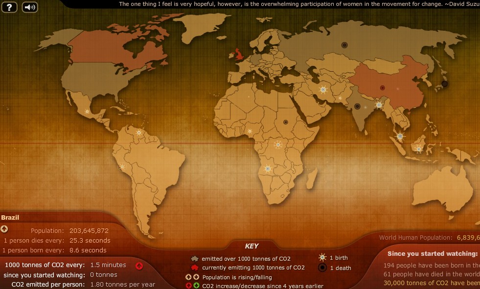 【简介】在这里可以看到每一个国家的出生和死亡人数,以及像自杀般向大气中排放的二氧化碳数量时,相信我,那种感觉就好像你自己就是上帝一样,在俯视着这个星球的一切活动