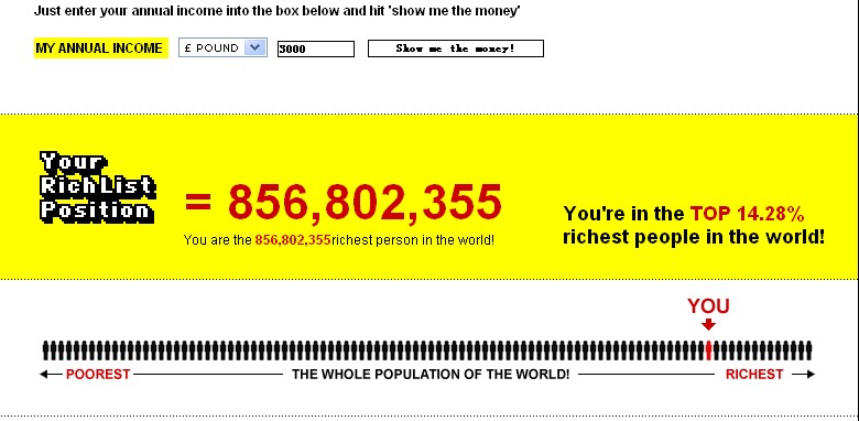 【简介】输入你的年收入,可以查询到你的财富在全世界排名多少,输入的时候记得要以美元或者英镑为单位