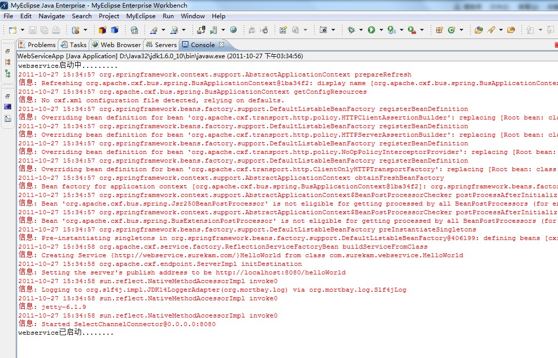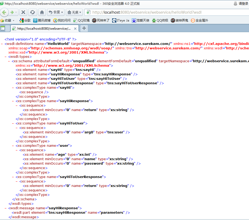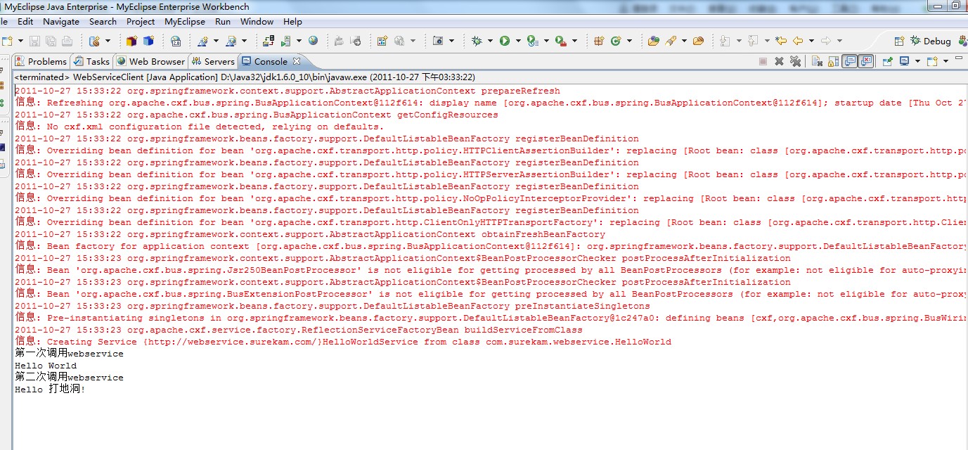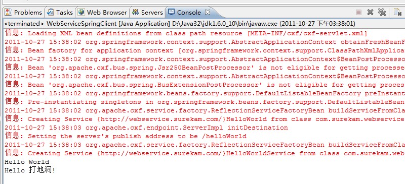 package com.surekam.webservice;import javax.jws.WebService;@WebServicepublic interface HelloWorld { public String sayHi(); public String sayHiToUser(User user);}package com.surekam.webservice;import javax.jws.WebService;@WebService(endpointInterface="com.surekam.webservice.HelloWorld",serviceName="HelloWorld")public class HelloWorldImpl implements HelloWorld{public String sayHi() {return "Hello World";}public String sayHiToUser(User user) {String name=user.getName();return "Hello "+ name +"!";} }package com.surekam.webservice;import javax.xml.ws.Endpoint;/** * @author Administrator * 服务端 * */public class WebServiceApp {public static void main(String[] args) {System.out.println("webservice启动中.........");HelloWorldImpl impl=new HelloWorldImpl();String address="http://localhost:8080/helloWorld";//设置地址Endpoint.publish(address,impl);System.out.println("webservice已启动........");}}package com.surekam.webservice;import org.apache.cxf.jaxws.JaxWsProxyFactoryBean;/** * @author Administrator 客户端 * */public class WebServiceClient {public static void main(String[] args) {JaxWsProxyFactoryBean factory = new JaxWsProxyFactoryBean();factory.setServiceClass(HelloWorld.class);factory.setAddress("http://localhost:8080/helloWorld");//服务端设置的地址HelloWorld helloworld = (HelloWorld) factory.create();// 强制转换为helloworld接口System.out.println("第一次调用webservice");System.out.println(helloworld.sayHi());// 调用远程的service服务 输出sayHi方法中的内容System.out.println("第二次调用webservice");User user=new User();user.setName("打地洞");System.out.println(helloworld.sayHiToUser(user));}}package com.surekam.webservice;import org.springframework.context.ApplicationContext;import org.springframework.context.support.ClassPathXmlApplicationContext;/** * @author Administrator *spring的客户端 */public class WebServiceSpringClient {public static void main(String[] args) {ApplicationContext context=new ClassPathXmlApplicationContext("applicationContext.xml");//这里知名配置文件的路径HelloWorld client =(HelloWorld)context.getBean("client");//通过getBean方法得到需要的文件System.out.println(client.sayHi());User user=new User();user.setName("打地洞");System.out.println(client.sayHiToUser(user));}}<?xml version="1.0" encoding="UTF-8"?><beans xmlns="http://www.springframework.org/schema/beans" xmlns:xsi="http://www.w3.org/2001/XMLSchema-instance" xmlns:jaxws="http://cxf.apache.org/jaxws" xsi:schemaLocation=" http://www.springframework.org/schema/beans http://www.springframework.org/schema/beans/spring-beans.xsd http://cxf.apache.org/jaxws http://cxf.apache.org/schemas/jaxws.xsd"><import resource="classpath:META-INF/cxf/cxf.xml"/> <import resource="classpath:META-INF/cxf/cxf-extension-soap.xml"/> <import resource="classpath:META-INF/cxf/cxf-servlet.xml"/> <jaxws:endpoint id="helloWorld" implementor="com.surekam.webservice.HelloWorldImpl" address="/helloWorld"/> <bean id="client" factory-method="create"/> <bean id="clientFactory" value="com.surekam.webservice.HelloWorld"></property> <property name="address" value="http://localhost:8080/webservice/webservice/helloWorld"></property> </bean></beans>