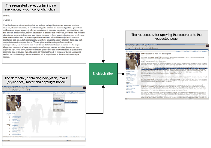 sitemesh应用Decorator模式,用filter截取request和response,把页面组件head,content,banner结合为一个完整的视图。通常我们都是用include标签在每个jsp页面中来不断的包含各种header, stylesheet, scripts and footer,现在,在sitemesh的帮助下,我们可以开心的删掉他们了。如下图,你想轻松的达到复合视图模式,那末看完本文吧。