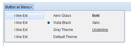 Ext.onReady(function() { Ext.QuickTips.init(); var menu = new Ext.menu.ColumnMenu({ menuWidth: 400, columns: [{ columnWidth: .33, items: [{ text: 'I like Ext', handler: onItemClick }, { text: 'I like Ext', handler: onItemClick }, { text: 'I like Ext', handler: onItemClick }, { text: 'I like Ext', handler: onItemClick }] }, { columnWidth: .33, items: [{ text: 'Aero Glass', checked: true, group: 'theme', checkHandler: onItemCheck }, { text: 'Vista Black', checked: false, group: 'theme', checkHandler: onItemCheck }, { text: 'Gray Theme', checked: false, group: 'theme', checkHandler: onItemCheck }, { text: 'Default Theme', checked: false, group: 'theme', checkHandler: onItemCheck }] }, { columnWidth: .33, items: [{ text: '<b>Bold</b>', handler: onItemClick }, { text: '<i>Italic</i>', handler: onItemClick }, { text: '<u>Underline</u>', handler: onItemClick }] }] }); var tb = new Ext.Toolbar(); tb.render('toolbar'); tb.add({ text: 'Button w/ Menu', menu: menu }); tb.doLayout(); function onItemClick(item) { msg('Menu Click', 'You clicked the "{0}" menu item.', item.text); } function onItemCheck(item, checked) { msg('Item Check', 'You {1} the "{0}" menu item.', item.text, checked ? 'checked' : 'unchecked'); } var msgCt; function createBox(t, s) { return ['<div class="msg">', '<div class="x-box-tl"><div class="x-box-tr"><div class="x-box-tc"></div></div></div>', '<div class="x-box-ml"><div class="x-box-mr"><div class="x-box-mc"><h3>', t, '</h3>', s, '</div></div></div>', '<div class="x-box-bl"><div class="x-box-br"><div class="x-box-bc"></div></div></div>', '</div>'].join(''); } function msg(title, format) { if (!msgCt) { msgCt = Ext.DomHelper.insertFirst(document.body, { id: 'msg-div' }, true); } msgCt.alignTo(document, 't-t'); var s = String.format.apply(String, Array.prototype.slice.call(arguments, 1)); var m = Ext.DomHelper.append(msgCt, { html: createBox(title, s) }, true); m.slideIn('t').pause(1).ghost("t", { remove: true }); }});