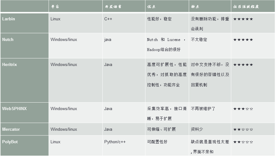 爬虫里面做的最好的肯定是google ,不过google公布的蜘蛛是很早的一个版本,下面是几种开源的网络爬虫的简单对比表: