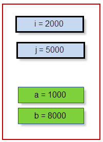 public class RawType {public static void main(String[] args) {int i = 2000;int j = 5000;changInt(i,j);System.out.println(i+" "+j);}private static void changInt(int a, int b) {a = 1000;b = 8000;}}