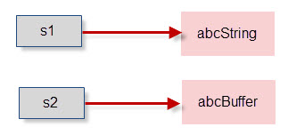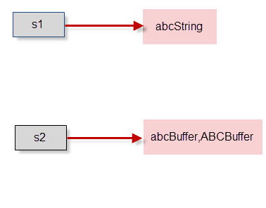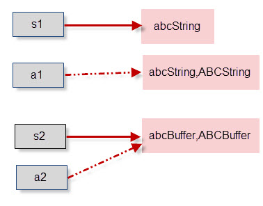 而changStringBuffer(StringBuffer a2)中执行a2.append(",ABCBuffer");时,并未产生新的对象,只是在原有对象的基础上追加",ABCBuffer",此时内存中的内存分配如图: