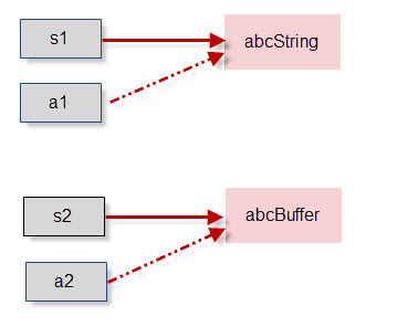 (2) 当方法changString(String a1),changStringBuffer(StringBuffer a2)被调用的时候,内存中分别产生了s1,s2的一份地址拷贝a1,a2它们的指向自然是和s1,s2一样,内存中的地址分配如图所示,