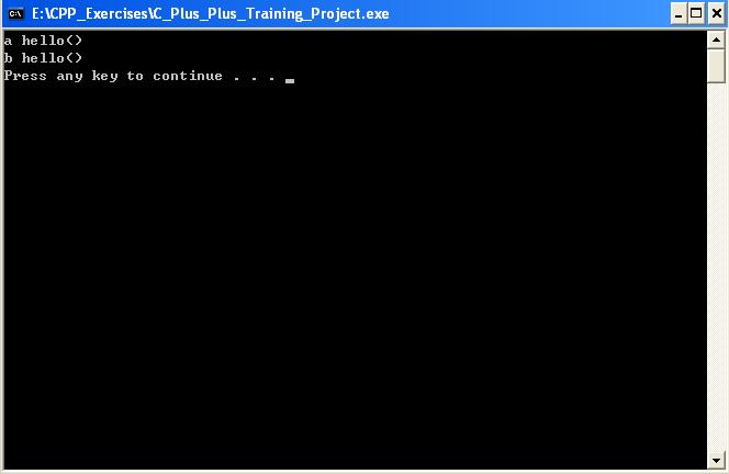 #include <iostream>#include <cstdlib>using namespace std;class a{ public : void virtual hello() { cout<<"a hello()"<<endl; } void hello(int i) { cout<<"a.hello(i)"<<i<<endl; } };class b: public a{ public: void hello() { cout<<"b hello()"<<endl; } void hello(int i) const { cout<<"b.hello(i)"<<i<<endl; } };int main(int argc,char * args[]){ { a *aptr=new b; aptr->hello(); b* bptr=new b; bptr->hello(); delete aptr; delete bptr; } system("pause"); return EXIT_SUCCESS; }