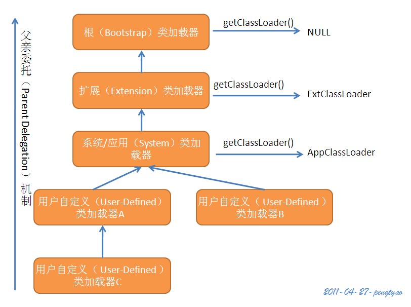 说明:类加载器之间的父子关系实际指的是加载器对象之间的包装关系,而不是类继承关系。一对父子加载器可能是同一个加载器类的两个实例。