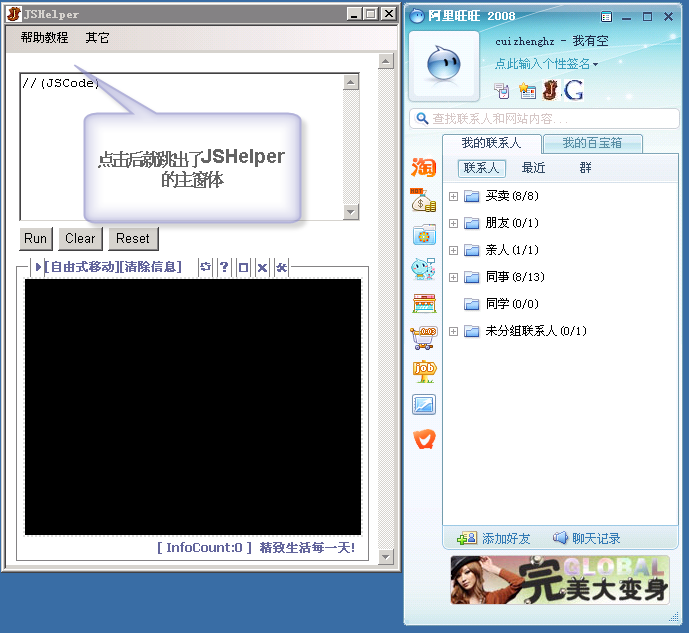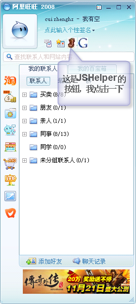 (轻便)调试JavaScript的旺旺插件(基于jzshmyt的javascript-logger) Demo如下,大家拍砖吧!请看下面介绍:程序代码:下面代码负责实现和旺旺IM通讯的接口,这里只响应了onClick事件。