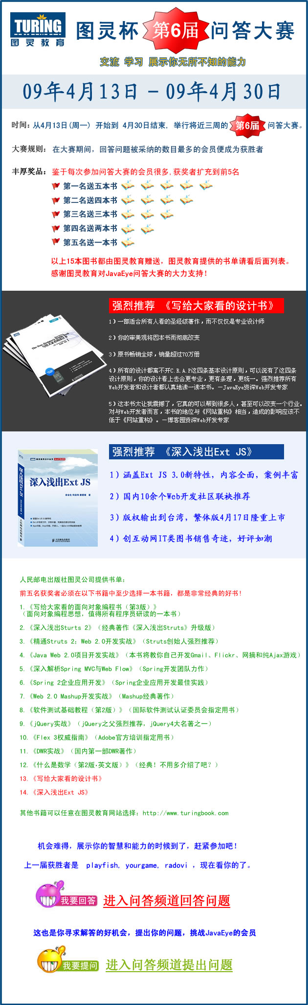 JavaEye图灵杯第6届问答大赛开始了!奖品丰厚!前五名都能获奖-4月13日至4月30日进入JavaEye问答频道人民邮