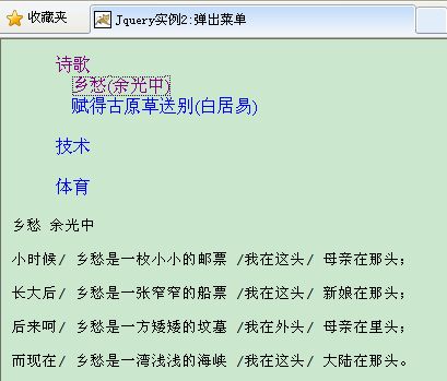 <!DOCTYPE HTML PUBLIC "-//W3C//DTD HTML 4.01 Transitional//EN"><html><head><title>Jquery实例2:弹出菜单</title><meta http-equiv="content-type" content="text/html; charset=UTF-8"><link href="css/menu.css" rel="stylesheet" type="text/css" /><script type="text/javascript" src="js/jquery-1.3.2.js"></script><script type="text/javascript" src="js/menu.js"></script></head><body><ul><a href="#">诗歌</a><li><a href="#" id="a.html">乡愁(余光中)</a></li><li><a href="#" id="b.html">赋得古原草送别(白居易)</a></li></ul><ul><a href="#">技术</a><li><a href="#">Flex/AIR</a></li><li><a href="#">Silverlight</a></li></ul><ul><a href="#">体育</a><li><a href="#" id="a.html">足球(欧洲风云)</a></li><li><a href="#" id="b.html">篮球(NBA战火)</a></li></ul><div id="content"></div></body></html>