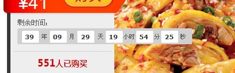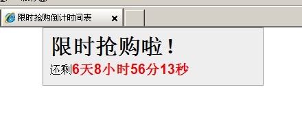 <!DOCTYPE html PUBLIC "-//W3C//DTD XHTML 1.0 Transitional//EN" "http://www.w3.org/TR/xhtml1/DTD/xhtml1-transitional.dtd"><html xmlns="http://www.w3.org/1999/xhtml"><head><meta http-equiv="Content-Type" content="text/html; charset=gb2312" /><title>限时抢购倒计时间表</title><style type="text/css">*{margin:0;padding:0;}#content{width:300px;margin:0 auto;padding:10px;background:#eee;border:1px solid #999;}#content p span{color:red;font:bold 20px Arial;}#content p a{font:12px/23px '宋体';color:#888;}.div1{ display:none;}</style></head><body><div id="content"><h1>限时抢购啦!</h1><p>还剩<span id="times"></span></p></div><SCRIPT LANGUAGE="JavaScript">function fresh(){ var endtime=new Date("2010/4/3,23:59:59"); var nowtime = new Date(); var leftsecond=parseInt((endtime.getTime()-nowtime.getTime())/1000); d=parseInt(leftsecond/3600/24); h=parseInt((leftsecond/3600)%24); m=parseInt((leftsecond/60)%60); s=parseInt(leftsecond%60); document.getElementById("times").innerHTML=d+"天"+h+"小时"+m+"分"+s+"秒"; if(leftsecond<=0){ document.getElementById("times").innerHTML="抢购已结束"; clearInterval(sh); }}fresh()var sh;sh=setInterval(fresh,1000);</SCRIPT></body></html>