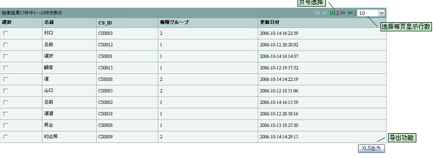 <ec:table items="operators" var="operator"action="${pageContext.request.contextPath}/sample.do"retrieveRowsCallback="limit" sortRowsCallback="limit" filterRowsCallback="limit"filterable="false" sortable="false" showExports="true"autoIncludeParameters="${empty param.autoInc?true:false}"><ec:exportCsv fileName="DepositHistory.csv" tooltip="CSV Download" /><ec:row><ec:column property="csLastName" title="名前" /><ec:column property="csId" title="CS_ID" /><ec:column property="csGroupId" title="権限グループ" /><ec:column property="updateDate" cell="date" title="更新日付" /></ec:row></ec:table> 该表格从集合operators中获取每行的元素,赋值给变量operator,用作每行处理的数据。
