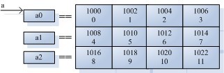 C语言允许把一个二维数组分解为多个一维数组来处理。因此数组a可分解为三个一维数组,即a[0],a[1],a[2]。每一个一维数组又含有四个元素。