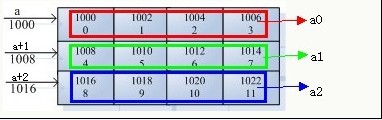 a是二维数组名,a代表整个二维数组的首地址,也是二维数组0行的首地址,等于1000。a+1代表第一行的首地址,等于1008。