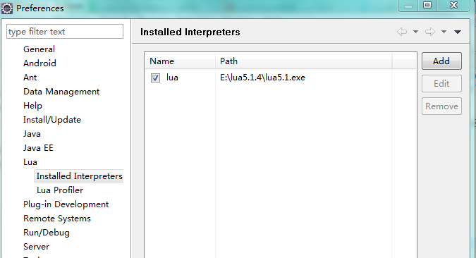 注意Path必须指向lua5.1.4_win32_bin的运行环境,我这里是E:\lua5.1.4\lua5.1.exe。