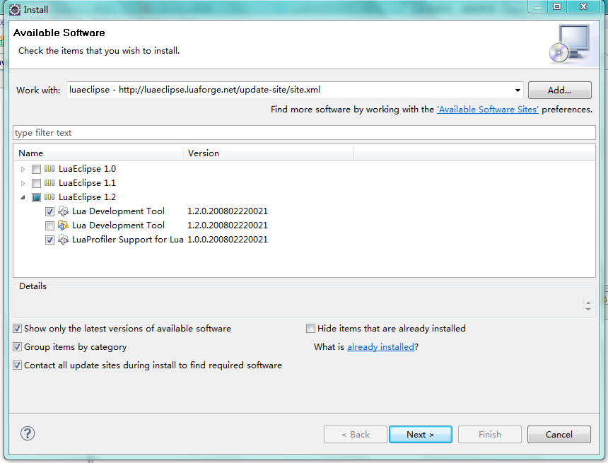 如果在安装LuaEclipse插件中遇到问题,请不要勾选中间一个选项,像下图那样我安装没问题: