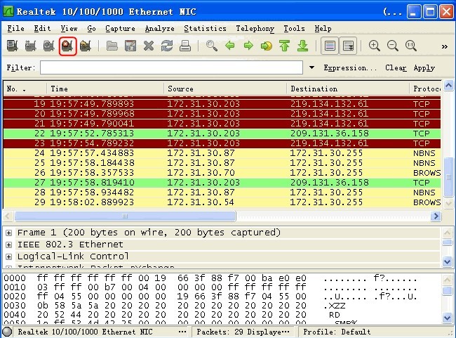 现在已经在抓包,抓包结束,后点击上图中红框的按钮停止抓包。这样我们就抓到了数据包。