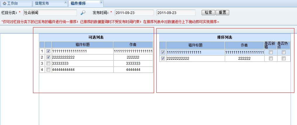 <script src="${ctx}/scripts/jqueryUI/jquery.ui.core.js"></script><script src="${ctx}/scripts/jqueryUI/jquery.ui.widget.js"></script><script src="${ctx}/scripts/jqueryUI/jquery.ui.mouse.js"></script><script src="${ctx}/scripts/jqueryUI/jquery.ui.sortable.js"></script><script type="text/javascript"><!--$(document).ready(function(){//设置查询模块的 栏目代码选中var v_lmdm = $("#wzxxfbgjpxForm #lmdmHidden").val();if(v_lmdm != '' && v_lmdm!=undefined){var t_select = $("#wzxxfbgjpxForm #lmdm")[0];var t_length = t_select.options.length;for(var i = 0 ;i < t_length ; i++){if(t_select.options[i].value==v_lmdm){t_select.options[i].selected = "selected";}}}//右表的行添加 自由拖动排序功能$("#rightTable tbody").sortable({stop:function(event,ui){}});$("#rightTable tbody").disableSelection();//给左右表添加鼠标移入移出 颜色 变化功能$("#rightTable tbody tr").live("mousemove ",function(){$(this).css("background","#d1e5ff");});$("#rightTable tbody tr").live("mouseout ",function(){$(this).css("background","");});$("#leftTable tbody tr").live("mousemove ",function(){$(this).css("background","#d1e5ff");});$("#leftTable tbody tr").live("mouseout ",function(){$(this).css("background","");});//日期默认显示当前日期var beginDate = $("#wzxxfbgjpxForm #fbsjBegin").val();var endDate = $("#wzxxfbgjpxForm #fbsjEnd").val();if(beginDate == '' || beginDate == 'null'){$("#wzxxfbgjpxForm #fbsjBegin").val($("#wzxxfbgjpxForm #currentDate").val());}if(endDate == '' || endDate == 'null'){$("#wzxxfbgjpxForm #fbsjEnd").val($("#wzxxfbgjpxForm #currentDate").val());}});//从左表 到 右表 function leftToRight(temp,v_gjid){//当点击 左表 某行被选中时if(temp.checked){var t_bt = $("#"+v_gjid).next().attr("title");var t_zz = $("#"+v_gjid).next().next().attr("title");var v_tr = '<tr id="'+v_gjid+'" style="text-align: center;"><input type="checkbox" name="itemsRight" checked="checked" onclick="javascript:rightToLeft(\''+v_gjid+'\')"></td>'+ '<td title="'+t_bt+'">'+t_bt+'</td>'+ '<td style="text-align: center;" title="'+t_zz+'">'+t_zz+'</td>'+ '<td style="text-align: center;"><input type="checkbox" name="sfxg"></td>'+ '<td style="text-align: center;"><input type="checkbox" name="sfrd"></td>'+ '</tr>';//插入新行到右表$("#rightTable tbody").append(v_tr);}//当点击 左表 某行没被选中时else{//删除对应的右表行$("#rightTable ."+v_gjid).empty();$("#rightTable ."+v_gjid).remove();}}// 从右表 到左表function rightToLeft(v_id){//取得 右表中点击行的 标题,作者var v_bt = $("#rightTable ."+v_id).children().eq(1).attr("title");var v_zz = $("#rightTable ."+v_id).children().eq(2).attr("title");$("#rightTable ."+v_id).empty();$("#rightTable ."+v_id).remove();var leftTr = $("#leftTable #"+v_id);if(leftTr !='' && leftTr != 'undefined' && leftTr != 'null' && leftTr.size()>0){$("#leftTable #"+v_id).children().removeAttr("checked");}else{//如果右表的行 在左表中没有,则需要添加新行var trNum = $("#leftTable tbody tr").size();var no = trNum+1;var trLeft = '<tr><td style="text-align: center;">'+no+'</td><td id="'+v_id+'" style="text-align: center;"><input type="checkbox" name="items" onclick="javascript:leftToRight(this,\''+v_id+'\');"></td>'+'<td title="'+v_bt+'">'+v_bt+'</td>'+'<td style="text-align:center;" title="'+v_zz+'">'+v_zz+'</td></tr>';//插入新行到左表$("#leftTable tbody").append(trLeft);}}//保存右表已经 排好序的 稿件function saveGjPx(){//排好序的 稿件ID数组var gjidArr = new Array();$(".rightGjid").each(function(i){gjidArr[i]=$(this).parent().attr("class");});var btArr = new Array();$(".rightBt").each(function(i){btArr[i]=$(this).text();});var zzArr = new Array();$(".rightZz").each(function(i){zzArr[i]=$(this).text();});var sfxgArr = new Array();$(".rightSfxg").each(function(i){if($(this).children().attr("checked") == "checked"){sfxgArr[i]="checked";}else{sfxgArr[i]="false";}});var sfrdArr = new Array();$(".rightSfrd").each(function(i){if($(this).children().attr("checked")=="checked"){sfrdArr[i]= "checked";}else{sfrdArr[i]="false";}});var parameters = new Object();parameters["gjidArr"]=gjidArr.toString();parameters["zzArr"]=zzArr.toString();parameters["btArr"]=btArr.toString();parameters["sfxgArr"]=sfxgArr.toString();parameters["sfrdArr"]=sfrdArr.toString();parameters["lmdm"] = $("#wzxxfbgjpxForm #pxselectedLMXXs").val();$.post("${ctx}/wzxxfbgjpx/saveOrder.json", parameters,function(data){if(data["message"]=='success'){alert("保存成功!");}},"json");}function checkQuery(){var lmdm = $("#wzxxfbgjpxForm #pxselectedLMXXs").val();var start = $("#wzxxfbgjpxForm #fbsjBegin").val();var end = $("#wzxxfbgjpxForm #fbsjEnd").val();if(lmdm == ''){alert("栏目代码不能为空!");return false;}if(start==''){alert("开始日期不能为空!");return false;}if(end==''){alert("结束日期不能为空!");return false;}return true;}//选择 栏目function px_toSelectLMEdit(){var opts = px_getDialogOptions();var url="${ctx}/wzxxfbgjpx/selectLMTree";$.pdialog.open(url, "wzxxfbgjpx_selectLM_dialog", "选择栏目", opts);}function px_getDialogOptions(){ var options = {};options.width = 640;options.height = 360;options.max = false;options.mask = true;options.maxable = false;options.minable = false;options.fresh = false;options.resizable = false;options.drawable = false;options.close = true;options.param = "";return options;}//--></script><div action="${ctx}/wzxxfbgjpx/search" method="post" onsubmit="return navTabSearch(this)"><input type="hidden" id="lmdmHidden" name="lmdmHidden" value="${lmdm }"><input type="hidden" id="currentDate" value="<fmt:formatDate value='${now }' pattern='yyyy-MM-dd'/>"/><div id="pxselectedLMMCs" name="pxselectedLMMCs" value="${pxLmmc }" readonly="readonly" size="30" /></td><td><input type="hidden" id="pxselectedLMXXs" name="pxselectedLMXXs" value="${pxLmdm }"><span onclick="px_toSelectLMEdit();"><a href="#"><span>栏目</span></a></span></td></tr></table></td><td id="fbsjBegin" name="fbsjBegi