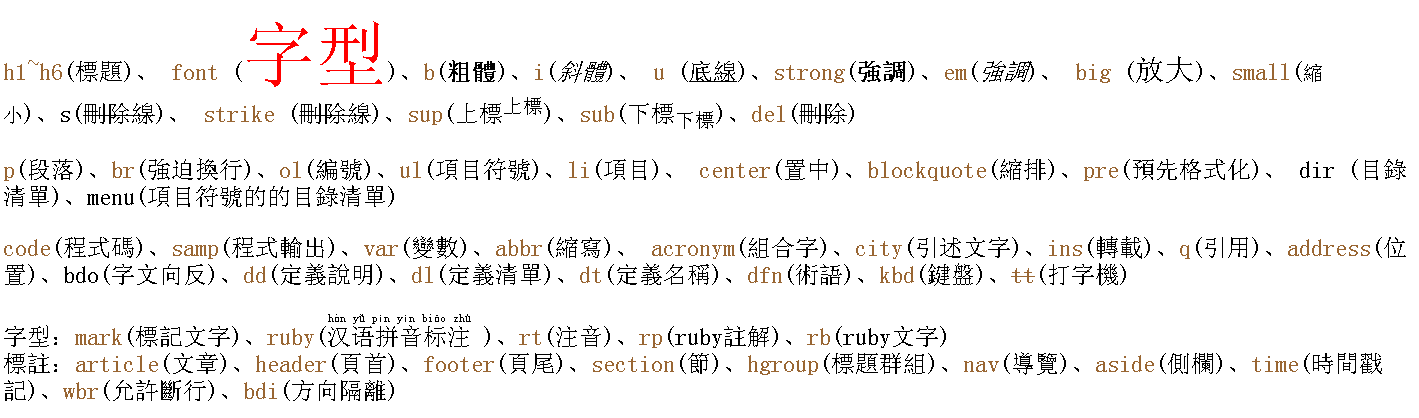 h1~h6(標題)、font(字型)、b(粗體)、i(斜體)、u(底線)、strong(強調)、em(強調)、big(放大)、small(縮小)、s(刪除線)、strike(刪除線)、sup(上標)、sub(下標)、del(刪除)