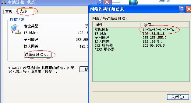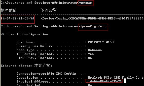 Windows 2000和Windows XP:点击“开始”菜单中的->“运行”菜单项 在“运行”窗口里输入“cmd",点击“确定”按钮 在打开的命令窗口里,执行“ipconfig /all”命令 Physical Address项即是MAC地址