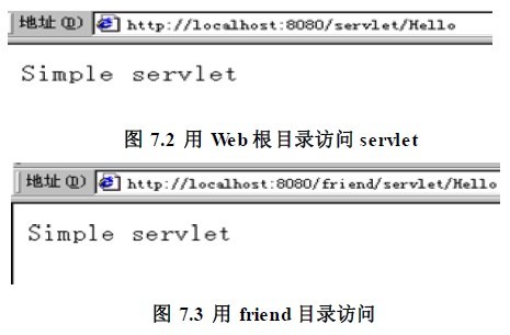 我们将Hello.class文件保存到Tomcat引擎的classes文件夹中。图7.2和7.3是在不同的web目录下运行servlet的效果。