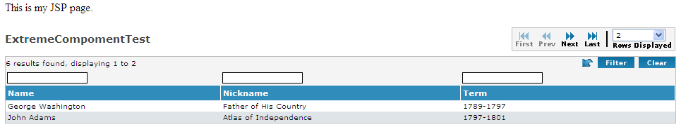 <% java.util.List presidents = new java.util.ArrayList(); java.util.Map president = new java.util.HashMap();president.put("name", "George Washington"); president.put("nickname", "Father of His Country"); president.put("term", "1789-1797"); presidents.add(president); president = new java.util.HashMap(); president.put("name", "John Adams"); president.put("nickname", "Atlas of Independence"); president.put("term", "1797-1801"); presidents.add(president); president = new java.util.HashMap(); president.put("name", "Thomas Jefferson"); president.put("nickname", "Man of the People, Sage of Monticello"); president.put("term", "1801-09"); presidents.add(president); president = new java.util.HashMap(); president.put("name", "James Madison"); president.put("nickname", "Father of the Constitution"); president.put("term", "1809-17"); presidents.add(president); president = new java.util.HashMap(); president.put("name", "James Monroe"); president.put("nickname", "The Last Cocked Hat, Era-of-Good-Feelings President"); president.put("term", "1817-25"); presidents.add(president); president = new java.util.HashMap(); president.put("name", "John Adams"); president.put("nickname", "Old Man Eloquent"); president.put("term", "1825-29"); presidents.add(president); request.setAttribute("pres", presidents); %> <ec:table items="pres" title="ExtremeCompomentTest" action="${pageContext.request.contextPath}/ExtremeCompomentTest_1.jsp" imagePath="${pageContext.request.contextPath}/images/table/*.gif" rowsDisplayed="2" > <ec:row> <ec:column property="name"></ec:column> <ec:column property="nickname"></ec:column> <ec:column property="term"></ec:column> </ec:row> </ec:table>