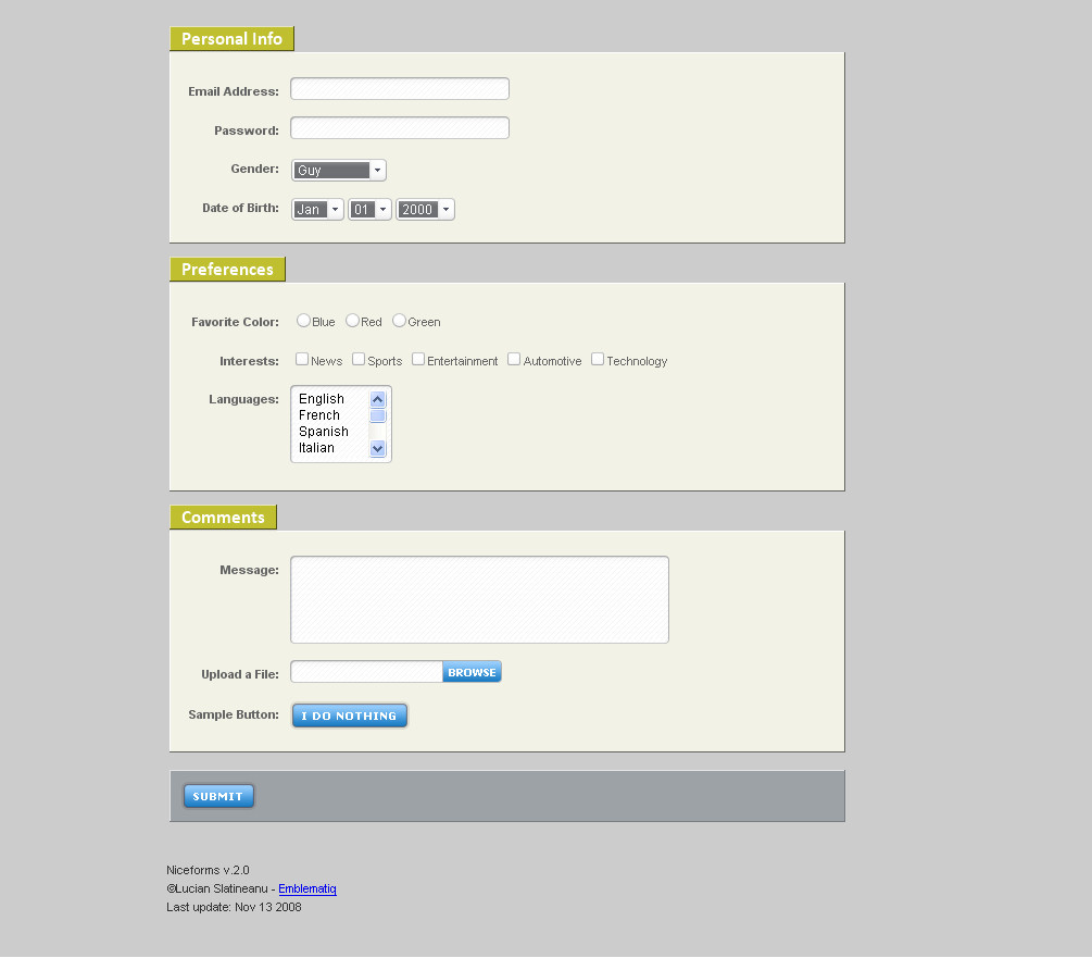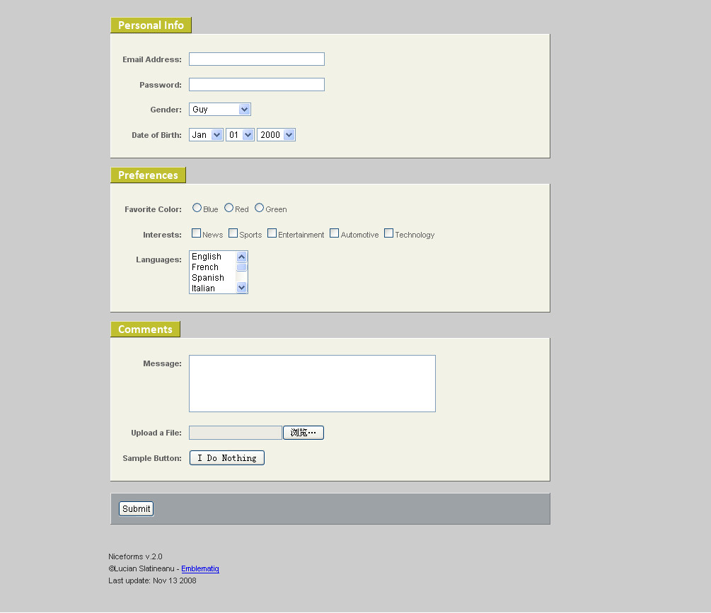 Niceforms是一个基于Javascript的控件,它用个性设计的内容替代最常用的表单元素。从本质上改变了浏览器默认的呆板的表单形式。