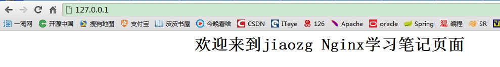 location / { root html; index index.html index.htm; } location / { root html; index jiaozg.html index.html index.htm; }<html><head><title>jiaozg</title><meta http-equiv="Content-Type" content="text/html; charset=utf-8" /></head><body bgcolor="white" text="black"><center><h1>欢迎来到jiaozg Nginx学习笔记页面</h1></center></body></html>